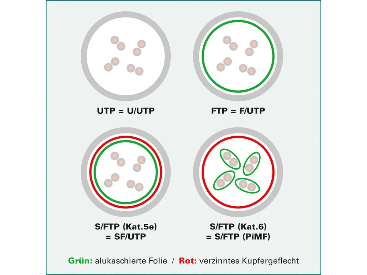 - Aufbau: 8 Adern Litzendraht. Paarweise Schirmung: Alu-kaschierte Polyesterfolie. Gesamtabschirmung: Kupfergeflecht