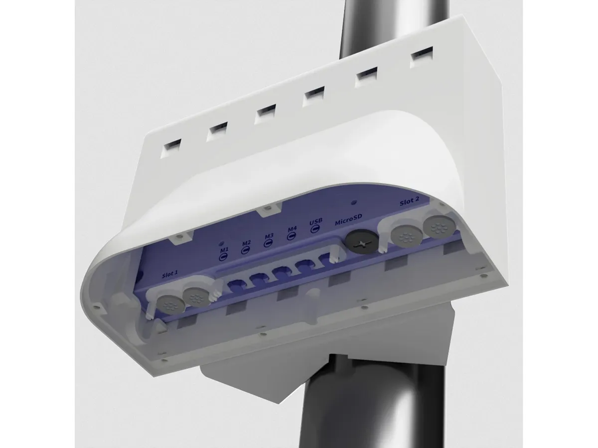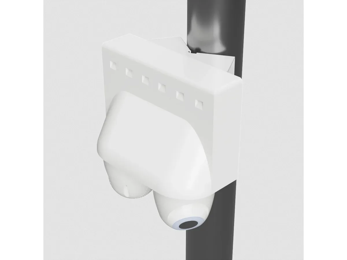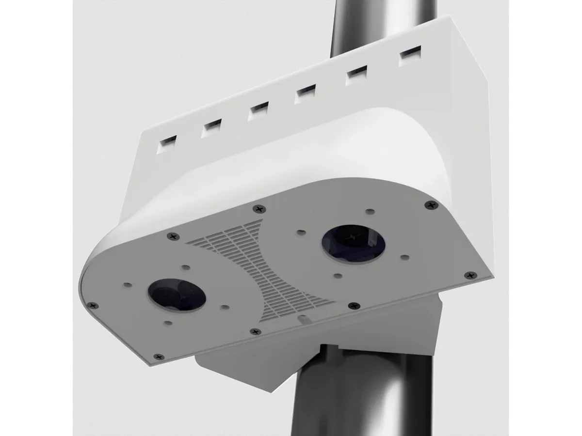 Diese 3D-gedruckte Chamäleon-Halterung aus PETG ermöglicht mit 2 Mobotix PT-MOUNT-Adaptern, die Sensoren in 2 verschiedene Richtungen auszurichten. Die Halterung wird mittels Mobotix Masthalterung an einem Mast montiert. Das Mxessories Chameleon Gehäuse verfügt über ein spezielles Design für die Belüftung mittels natürlichem Luftstrom, um eine angemessene Kühlung des S74-Körpers zu ermöglichen.