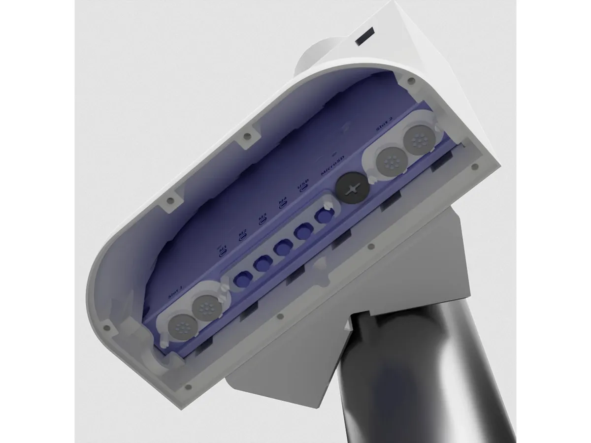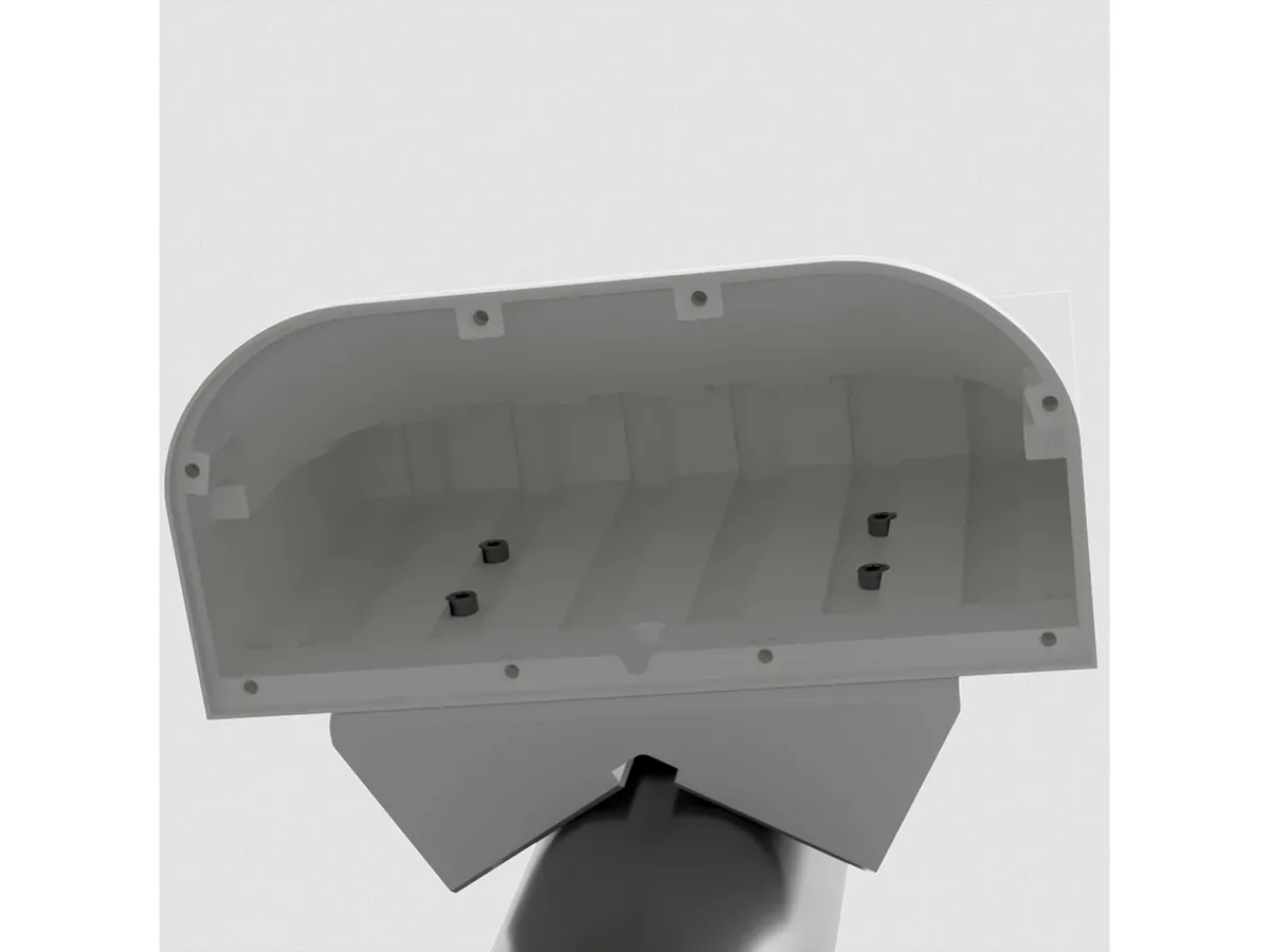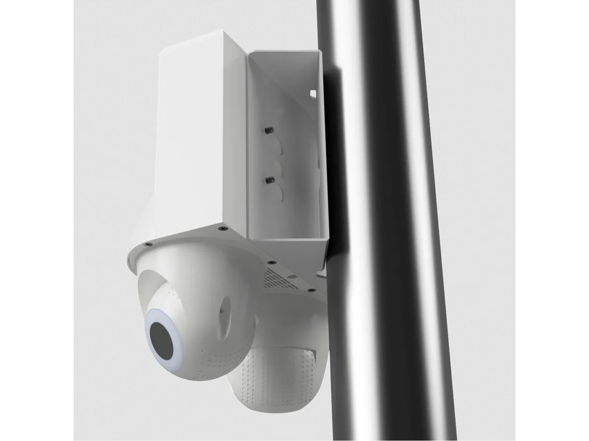 Diese 3D-gedruckte Chamäleon-Halterung aus PETG ermöglicht mit 2 Mobotix PT-MOUNT-Adaptern, die Sensoren in 2 verschiedene Richtungen auszurichten. Die Halterung wird mittels Mobotix Masthalterung an einem Mast montiert. Das Mxessories Chameleon Gehäuse verfügt über ein spezielles Design für die Belüftung mittels natürlichem Luftstrom, um eine angemessene Kühlung des S74-Körpers zu ermöglichen.